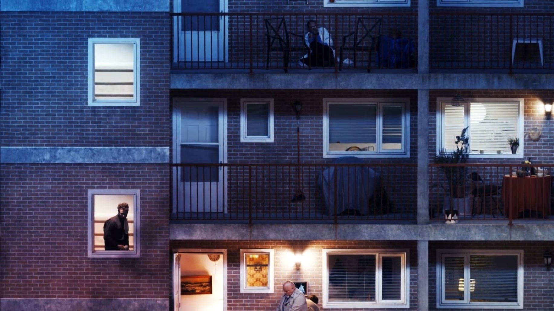A murder has been committed on a balcony. But it is only one of the many balconies attached to a large apartment block. Strange things are transpiring of each of them on loop. As the eye attempts to take them all in, the murder soon seems entirely unimportant.